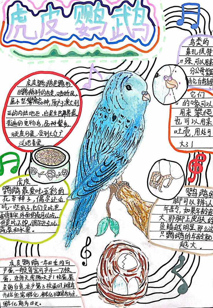 我家养了三只虎皮鹦鹉,它们穿着漂亮的花衣服,蓝黑相间的条纹整整齐齐从头顶一直蔓延到尾巴根,像老虎的花纹一样,特别帅气。