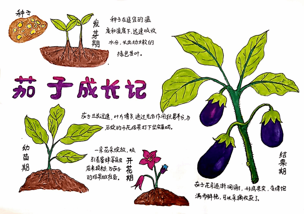 花落以后,小小的茄子就冒出来了,青青的,身上有软软的小刺。结果期的茄子长得可快了,每天都能看出变胖了点,慢慢变成深紫色,有的像弯弯的小船,有的像圆圆的小球,挂在枝头,真让人喜欢!