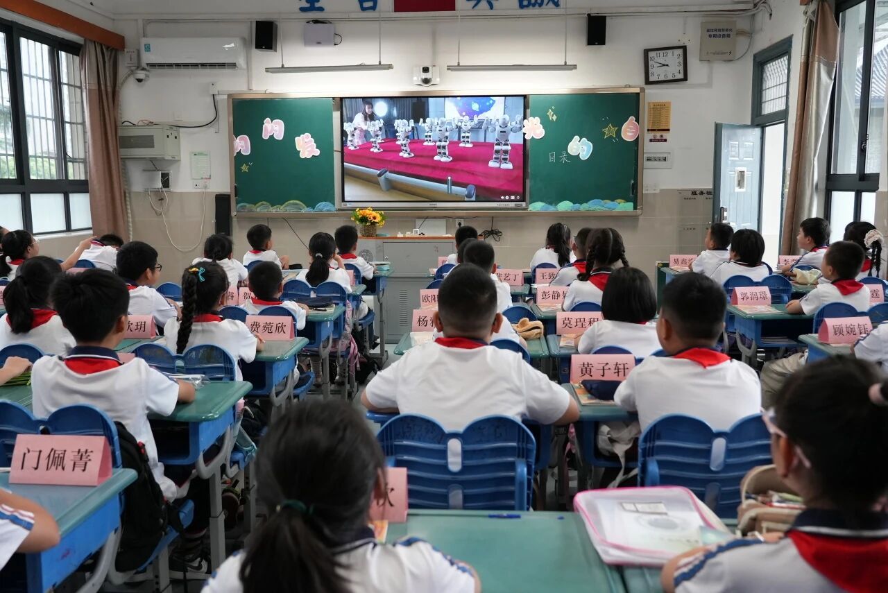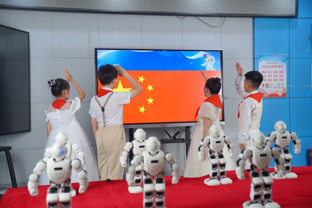 机器人舞蹈秀将现场气氛推向高潮,12台智能机器人以精准灵活的舞步展现了人工智能的无限可能,也让同学们直观体验到科技与创新的魅力。紧接着,主持人以嫦娥六号月球采样任务为例,生动讲述中国航天事业的辉煌成就,强调科技强国的重要性。