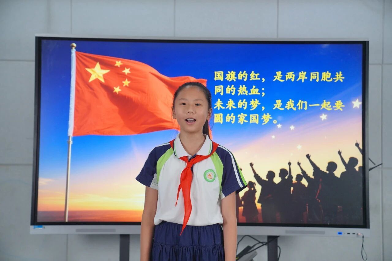 典礼特别设置“两岸同心,共创未来”板块,营盘路小学六年级(1)班廖南瑄同学代表全体少先队员发表《同擎一面旗,共赴一个未来》的讲话,强调祖国统一是全体中华儿女的共同心愿。