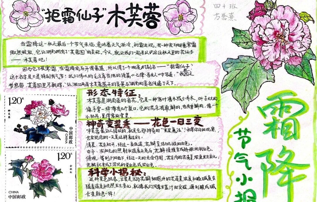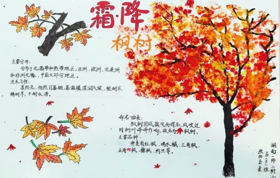 在这个沉淀与收获的节气里,附小的孩子们走进自然,用心记录万物的秘密。他们尝到了经霜后格外清甜的果实,寻到了在泥土中安眠的小虫,拾起了飘落如蝶的彩叶,凝视着一天三变的芙蓉。他们用稚嫩的笔触,写下霜降的物候笔记,也记下了对这个季节最温柔的解读。