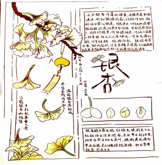早上我去青少年宫跑步,刚走到门口,就被几棵银杏树拦住了脚步。夏天时它们穿着绿衣裳,乍一看,现在依然是绿得那么深沉,不过,如果你走近一些,看仔细一点,这些微型版的小绿扇子被秋姑娘悄悄地在扇子的边沿浅浅地涂上了浅黄色的边儿。来到烈士公园,年嘉湖边的银杏树又不一样了。有一棵银杏树的树叶总是要黄得比别处的早,有的小扇子全都黄透了,有的黄绿相间。有的银杏树上有金黄色的果子缀满了枝头,妈妈告诉我,这种果子是一味中药,但用手直接去捡会引起皮肤过敏。