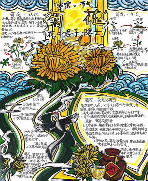 寒露是菊花开始盛开的时候,寒菊卷黄是这个节气的主色调。 唐朝的元稹写到:“寒露惊秋晚,朝看菊渐黄。”时至深秋,百花殆尽,唯有菊花傲然开放。