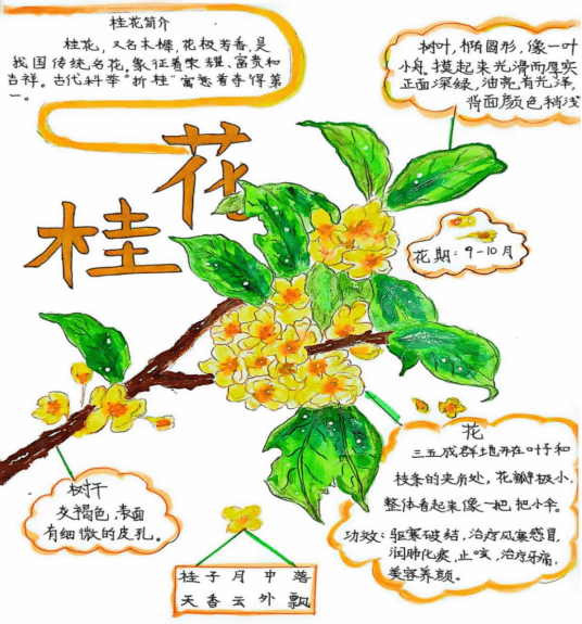 桂花不仅爽心悦目,清新空气,还能做好吃的点心。我每次偷摘点桂花,放到瓶子里,拿回家,让手巧的奶奶做桂花糕。那又大又香的桂花糕,咬一口,糯糯的,满口花香,真好吃。