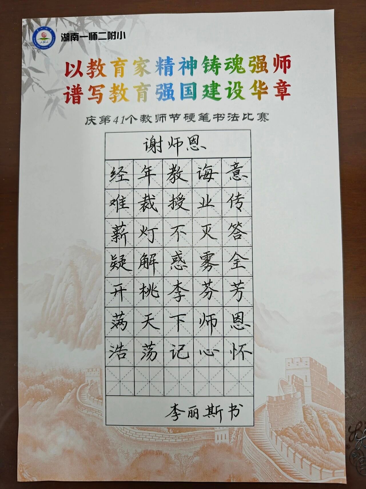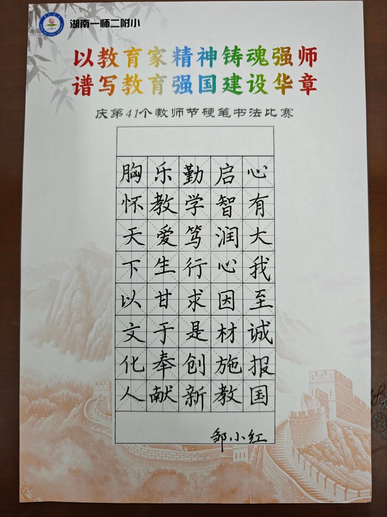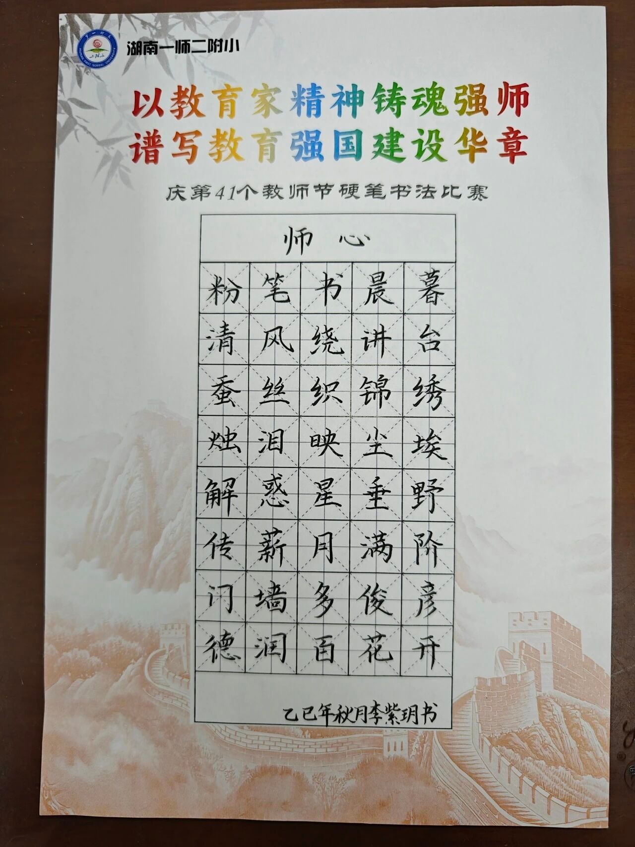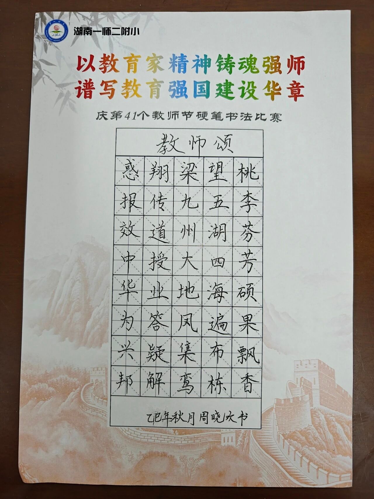 一笔一画写初心,一字一句载师道。2025年9月10日,在这个充满敬意的教师节,湖南第一师范学院第二附属小学工会别出心裁,组织开展了一场充满墨香与诗意的硬笔书法比赛,为全校教师送上一份兼具文化底蕴与心灵温度的特别节日礼物。