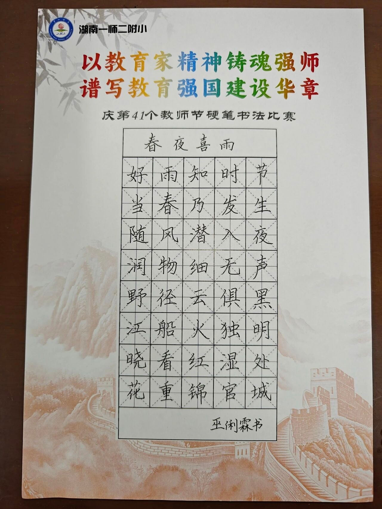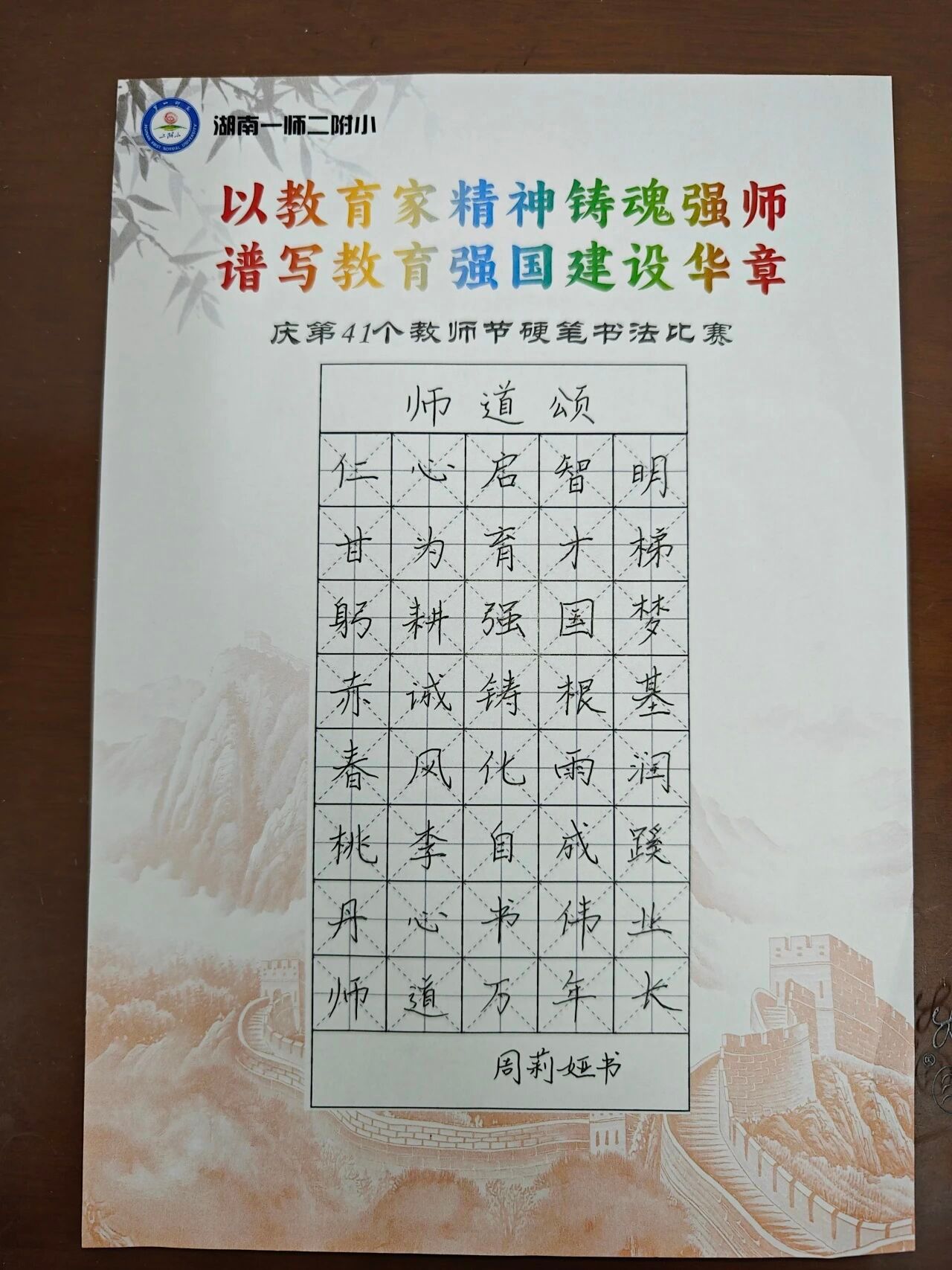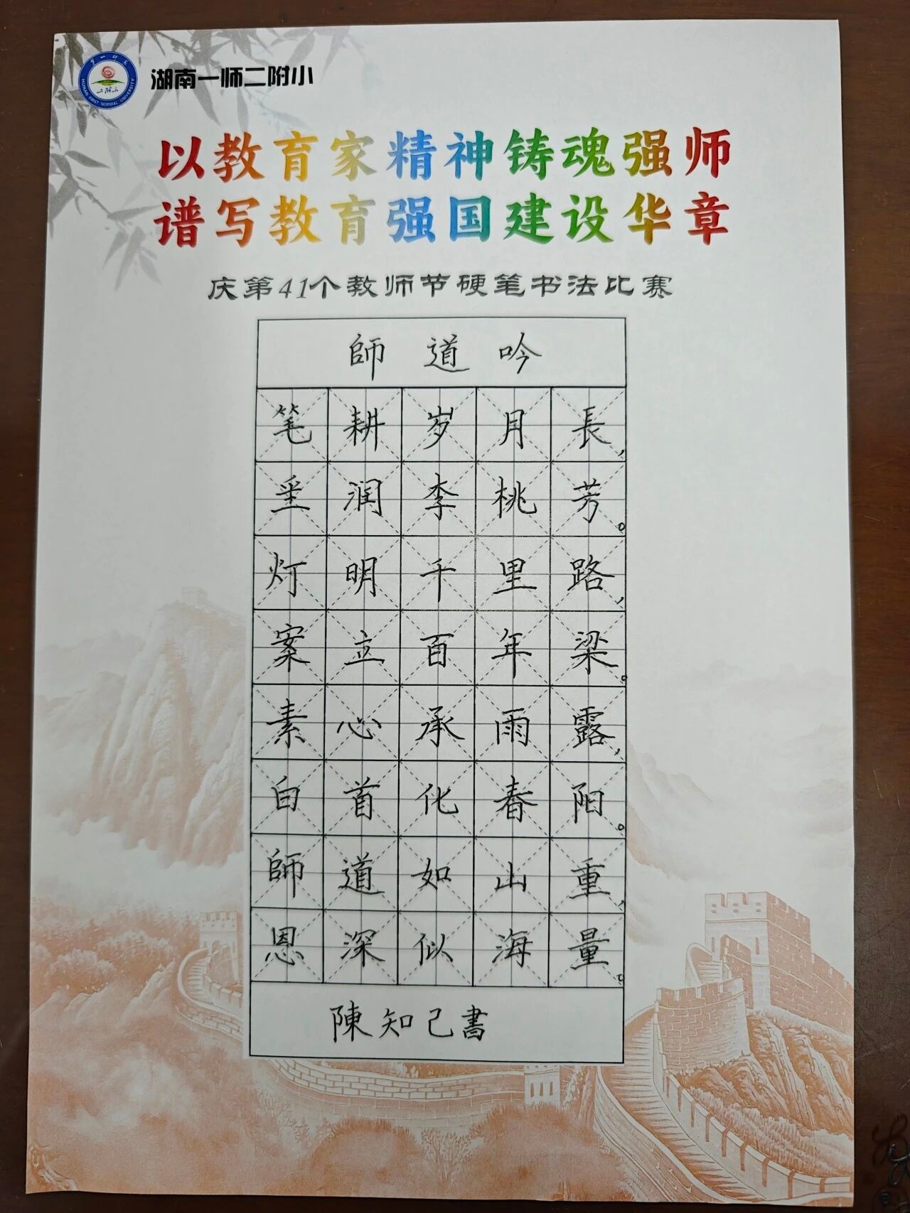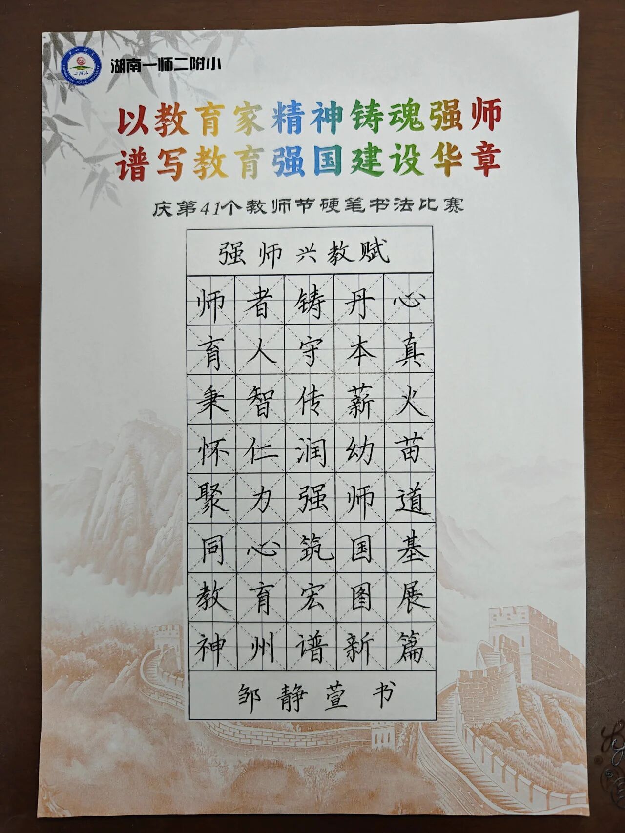 一笔一画写初心,一字一句载师道。2025年9月10日,在这个充满敬意的教师节,湖南第一师范学院第二附属小学工会别出心裁,组织开展了一场充满墨香与诗意的硬笔书法比赛,为全校教师送上一份兼具文化底蕴与心灵温度的特别节日礼物。