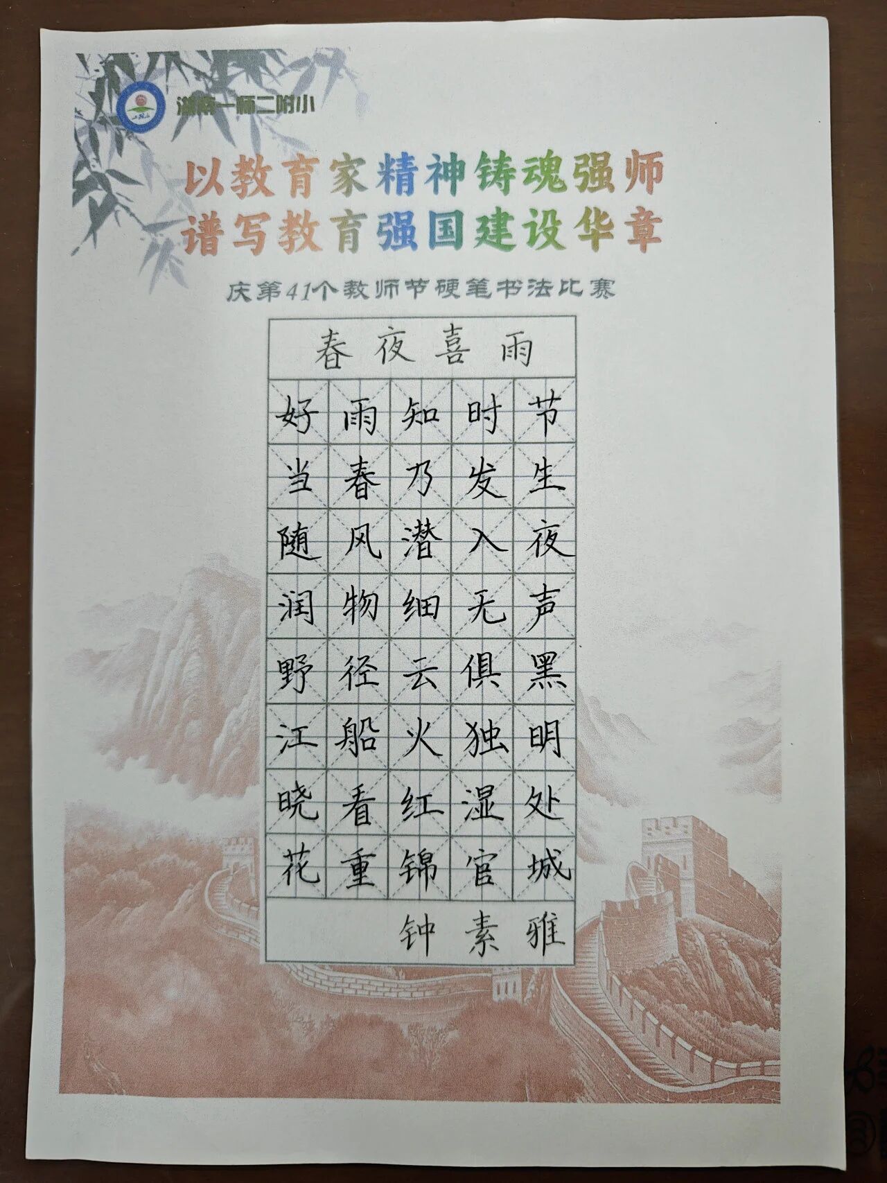 活动中,学校工会主席周玲军指出:“教师既要传授知识,更要以自身修养涵养文化,以人格力量影响学生。硬笔书法不仅是一种教学基本功,更是师德与师魂的外在写照。”本次比赛秉持“以赛促学、以写促教”的宗旨,引导教师在笔墨中修身养性,于字里行间寄托教育初心,真正做到翰墨飘香、师魂流韵。