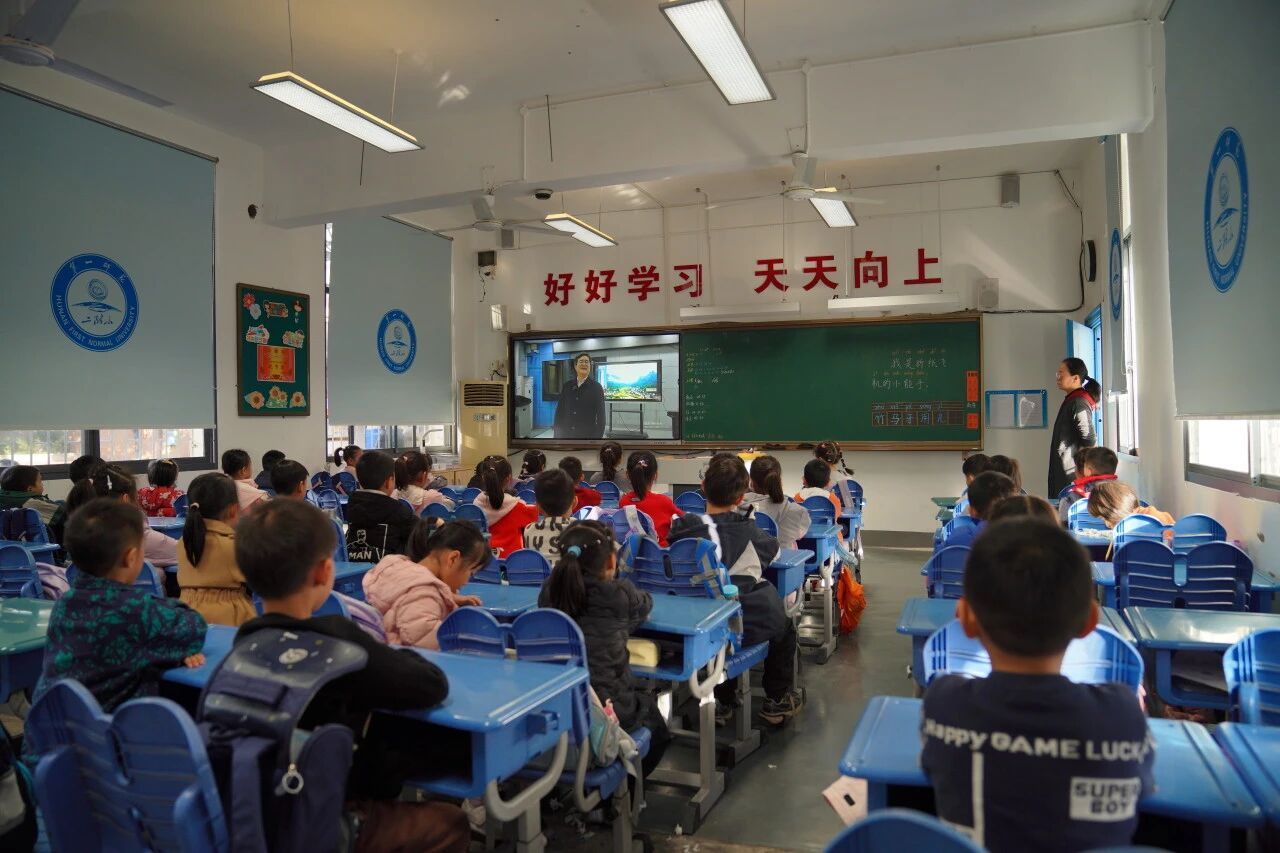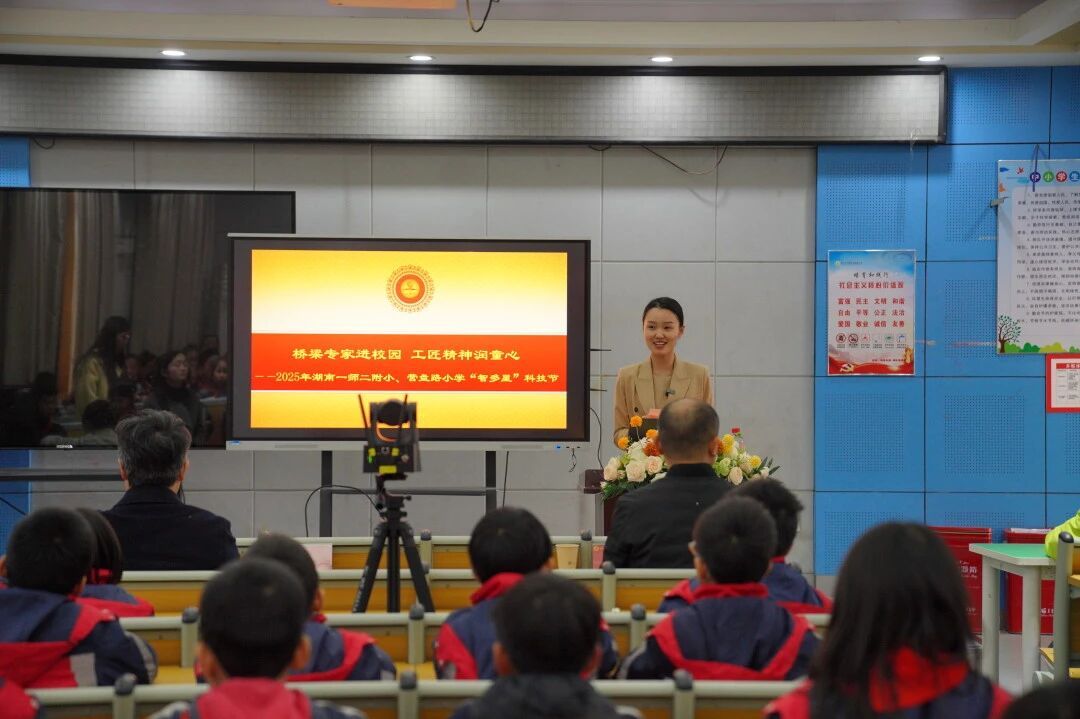 当天下午,湖南一师二附小三、四年级和营盘路小学五、六年级的学生代表们,早早来到多媒体教室,有序就座。孩子们眼神中充满了对“大桥设计师”的期待与好奇。与此同时,两校其余班级的同学也在教室通过直播同步收看,线上线下共享这场科学盛宴。