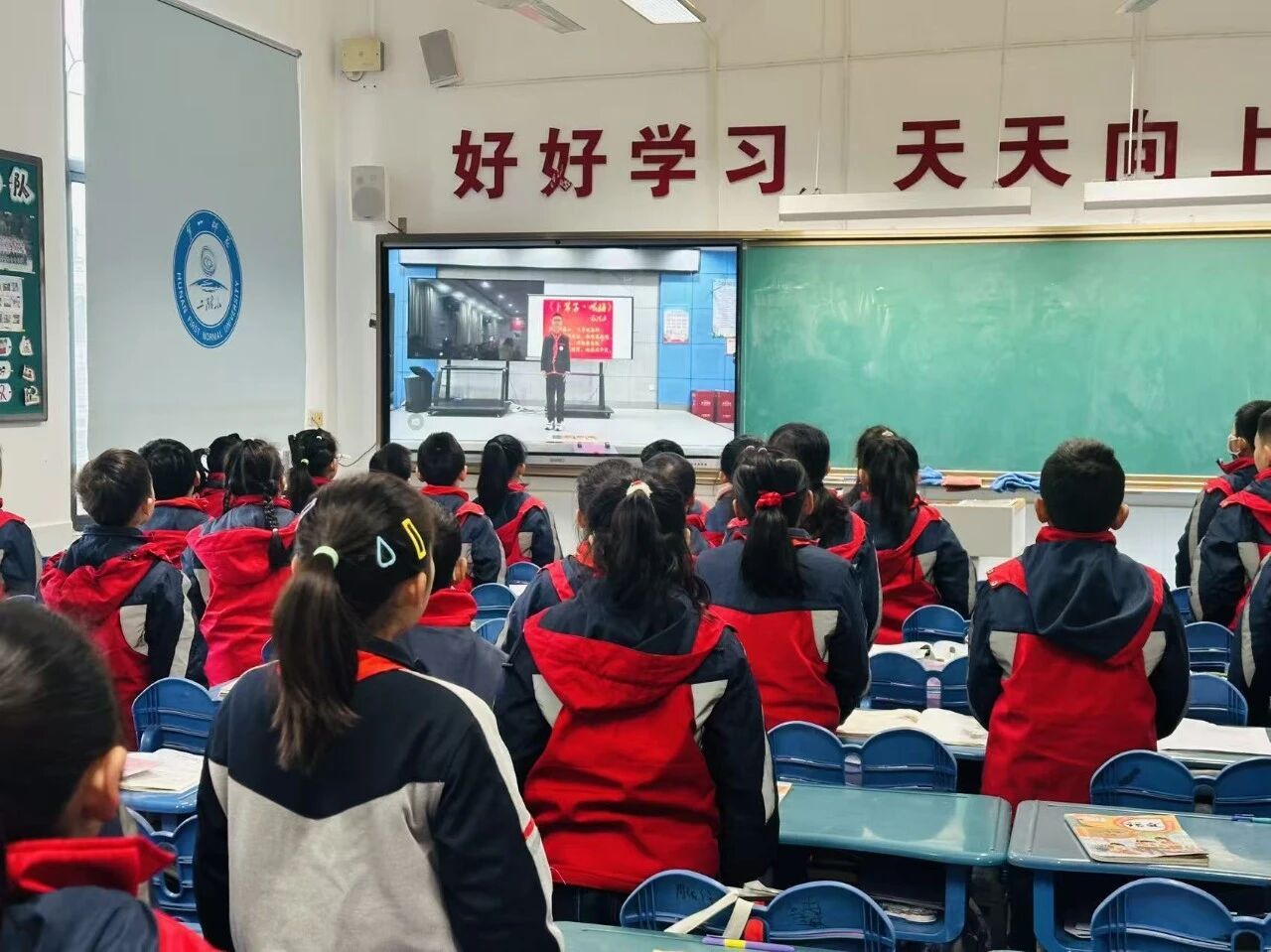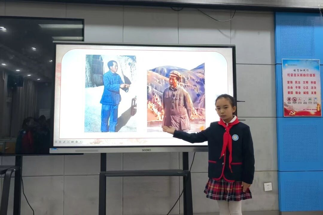 随后,谢雨辰同学讲述了《毛主席的一件棉衣》的故事。通过毛泽东同志在延安时期将新棉衣赠予老乡、自己却身着旧衣的感人细节,生动诠释了“人民领袖”与人民同甘共苦、心系百姓的崇高品质。紧接着,全场共同观看了记录毛泽东同志与人民在一起的珍贵影像短片,进一步感受到他深厚的人民情怀。
