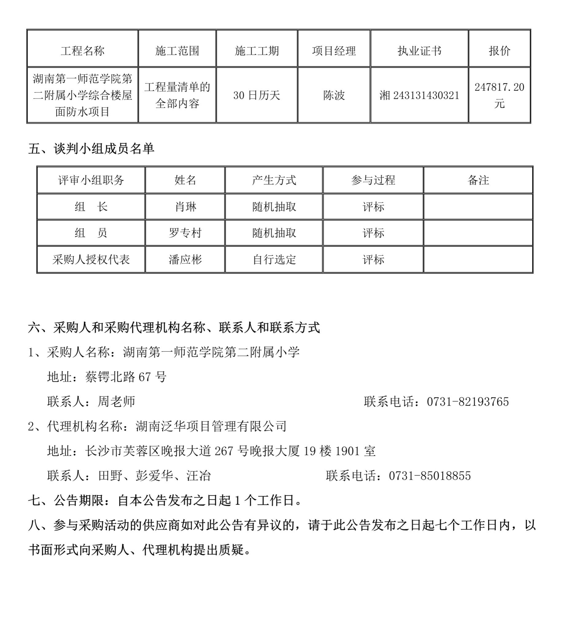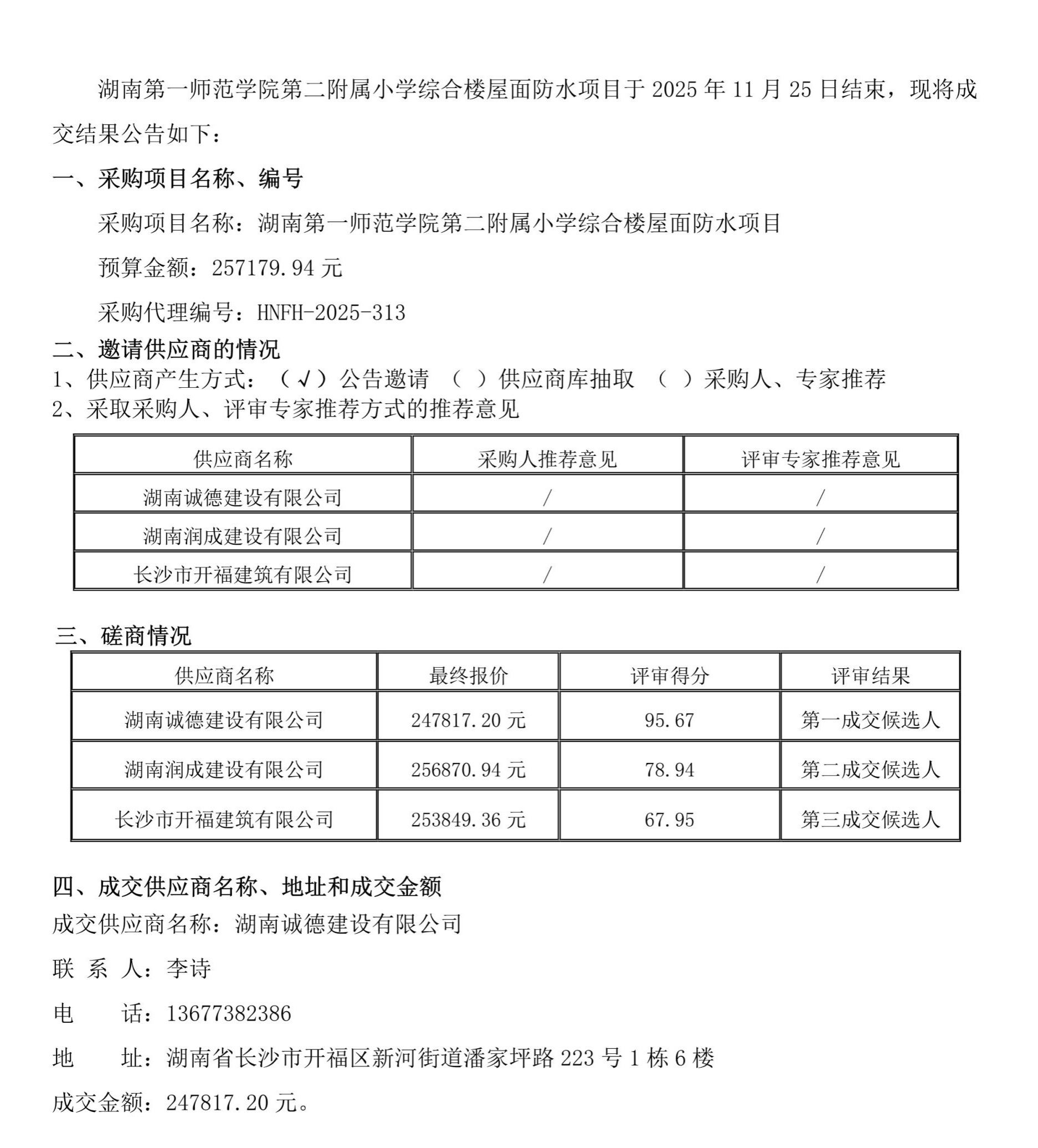 湖南第一师范学院第二附属小学综合楼屋面防水项目成交结果公告